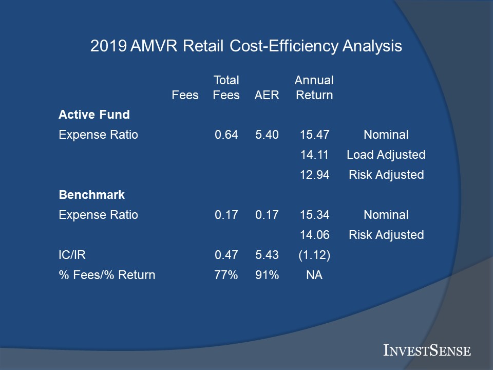 Note the “Load Adjusted” note in the annualized return column for the active fund. Actively managed funds usually imposes a “front-end” load, or commission, at the time that an investor purchases shares in their fund. The “front-end load is often in the range of 6-6.5 percent. The front-end load is immediately deducted from the amount of the investor’s investment. This not only reduces the actual amount of the investor’s investment, but also the investor’s end-return relative to funds that do not impose front-end loads.